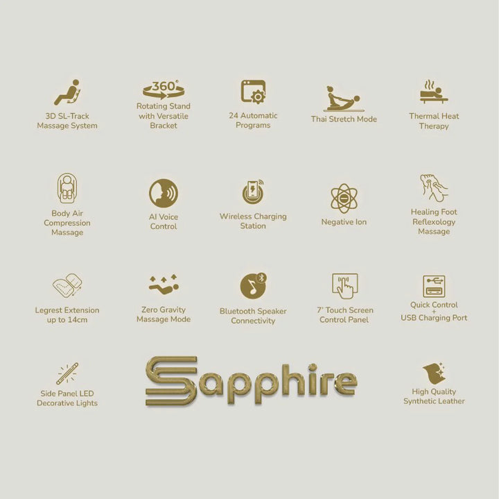 Bring the spa home with the Sapphire Massage Chair — your complete solution for pain relief, relaxation, and better sleep. Designed with modern technology and comfort in mind, it offers the perfect blend of luxury and wellness for your daily routine.